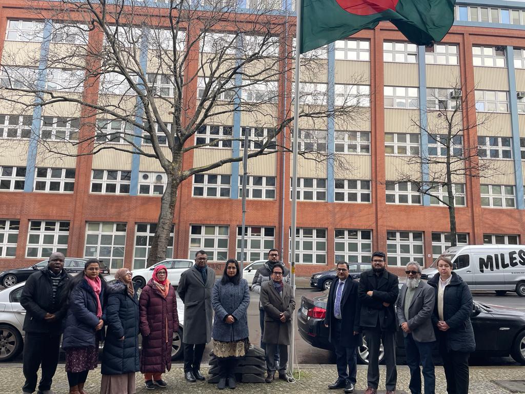 বাংলাদেশ দূতাবাস, বার্লিন যথাযোগ্য মর্যাদায় ও বিনম্র শ্রদ্ধায় ঐতিহাসিক ৭ই মার্চ দিবস পালন করেছে। মান্যবর রাষ্ট্রদূত জনাব মো.মোশাররফ হোসেন ভূঁইয়া(এনডিসি) মহোদয়ের নেতৃত্বে দূতাবাসের কর্মকর্তা ও কর্মচারির উপস্থিতিতে দূতাবাস প্রাঙ্গণে জাতীয় পতাকা উত্তোলনের মাধ্যমে দিবসের কর্মসূচীর সূচনা করা হয়। তারপর মান্যবর রাষ্ট্রদূত উপস্থিত সকলকে নিয়ে জাতির পিতা বঙ্গবন্ধু শেখ মুজিবুর রহমান-এর প্রতিকৃতিতে পুষ্পস্তবক অর্পণ করেন।