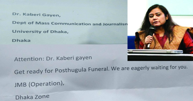 জার্মান-বাংলা রিপোর্ট: ঢাকা বিশ্ববিদ্যালয়ের (ঢাবি) অধ্যাপক ড. কাবেরী গায়েনকে হত্যার হুমকি দিয়ে চিঠি পাঠিয়েছে জামায়াতুল মুজাহিদিন বাংলাদেশ (জেএমবি)। তবে চিঠিতে কোনো কারণ উল্লেখ করা হয়নি। হুমকিতে থাকা ঢাবির গণযোগাযোগ ও