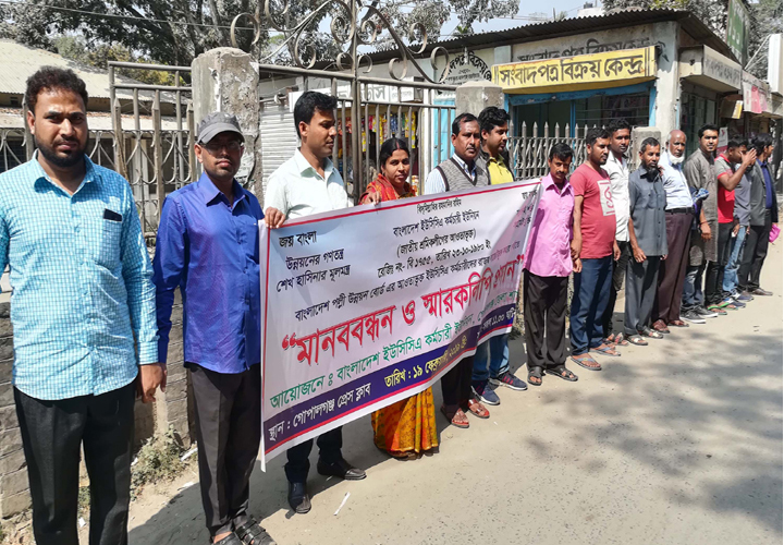এম শিমুল খান, গোপালগঞ্জ : গোপালগঞ্জে বাংলাদেশ পল্লী উন্নয়ন বোর্ডের আওতাভুক্ত ইউসিসিএ কর্মচারীদেরকে রাজস্ব বাজেট ভুক্ত করার দাবীতে মানবন্ধন কর্মসুচী পালিত হয়েছে। মঙ্গলবার বিকালে গোপালগঞ্জ প্রেসক্লাবের সামনে প্রায় ঘন্টাব্যাপী এ