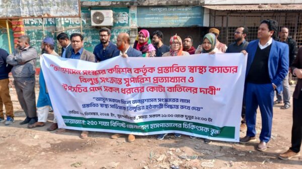 “জনপ্রশাসন সংস্কার কমিশন কর্তৃক প্রস্তাবিত স্বাস্থ্য ক্যাডার বিলুপ্ত সংক্রান্ত সুপারিশ প্রত্যাখ্যান ও উপসচিব পদে সকল ধরণের কোটা বাতিলের দাবিতে ঝিনাইদহে মানববন্ধন কর্মসূচি পালিত হয়েছে। বৃহস্পতিবার সকালে সদর হাসপাতাল চত্বরে ঘন্টা