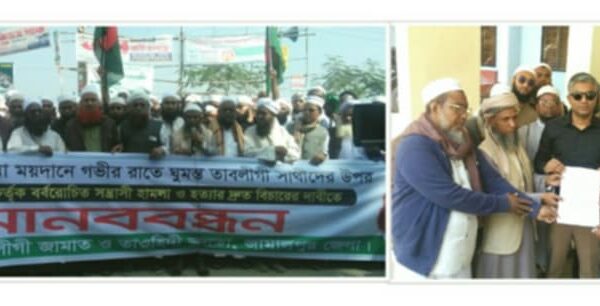 টঙ্গী বিশ্ব ইজতেমা ময়দানে গভীর রাতে ঘুমন্ত তাবলীগী সাথীদের উপর খুনি সাদ’পন্হী কতৃক বর্বরোচিত সন্ত্রাসী হামলা ও হত্যার দ্রুত বিচারের ও ৭ দফা দাবিতে তাবলীগী জামাত ও তাওহিদী জনতা জামালপুর