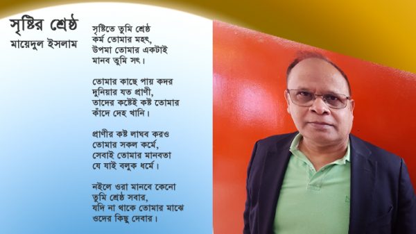 সৃষ্টিতে তুমি শ্রেষ্ঠ কর্ম তোমার মহৎ, উপমা তোমার একটাই মানব তুমি সৎ। তোমার কাছে পায় কদর দুনিয়ার যত প্রাণী, তাদের কষ্টেই কষ্ট তোমার কাঁদে দেহ খানি। প্রাণীর কষ্ট লাঘব করও